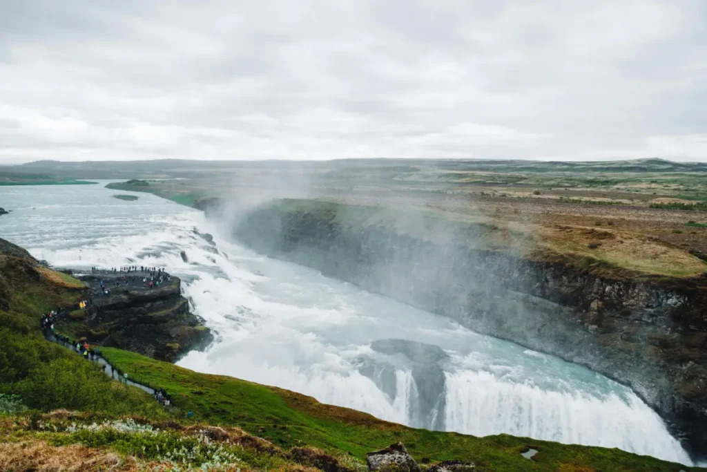 Gullfoss is one of Iceland’s most iconic and powerful waterfalls. With a total drop of 32 meters (105 feet), the waterfall cascades in two stages. The waterfall first descends approximately 11 meters (36 feet) and then plunges 21 meters (69 feet) into the deep canyon. The sheer power of the falls is quite an awe-inspiring thing to witness, and seeing the water surging through the gorge is quite spectacular. There are several viewing platforms offering different perspectives of the falls. You might even catch a rainbow emerging in the mist of the waterfall on a sunny day. The site is stunning year-round, with winter bringing a beautiful contrast as the falls take on a snowy white costume.